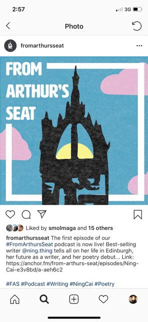 My inspiration for the cover was postcards; the anthology is a collection of work from writers from around the world, that came together to study at the University of Edinburgh. The back blurb is handwritten by one of the writers, Merel de Beer, and acts as the "note" written from the anthology's contributors to the readers. The stamp, featured on the back cover and the spine, was inspired by From Arthur's Seat logo, which is inspired by St Giles Cathedral. The sunset can be seen through the cupola, and so I drew inspiration from this to recreate an evening scene of the Edinburgh skyline.